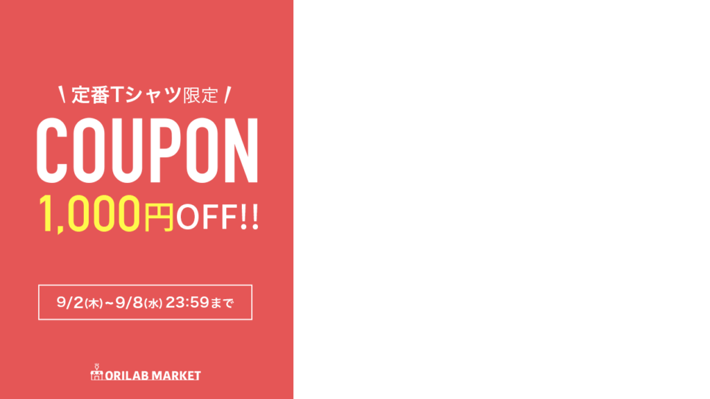 セール 定番Tシャツ 1000円OFF クーポン配布中! hori 2021-09-01 / 2022-02-07 1番人気の定番Tシャツについて1,000円OFFになるクーポンをご用意させていただきました。 対象商品 : 定番Tシャツ 割引内容 : 1点につき表示価格より1,000円OFF クーポンコード : ORMX4F61BGAQCR8 利用可能期間 : 〜 9/8(水) 23:59 (期間中何回でもクーポン利用可能) セール対象の商品を見る ▼Twitterで宣伝される際の素材としてぜひクーポンコードと合わせてご活用くださいませ クーポン