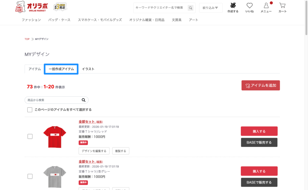 ・今後、「一括でアイテムを作る」機能から作成した商品は、自動的に「一括作成アイテム」タブに表示されます。