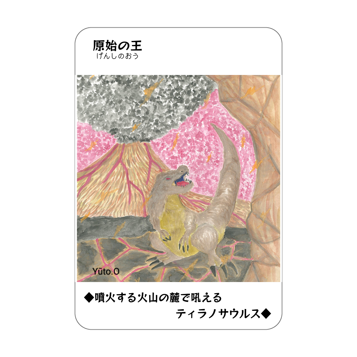 噴火する火山の麓で吼えるティラノサウルスが描かれたアクリル製のコレクションカード。