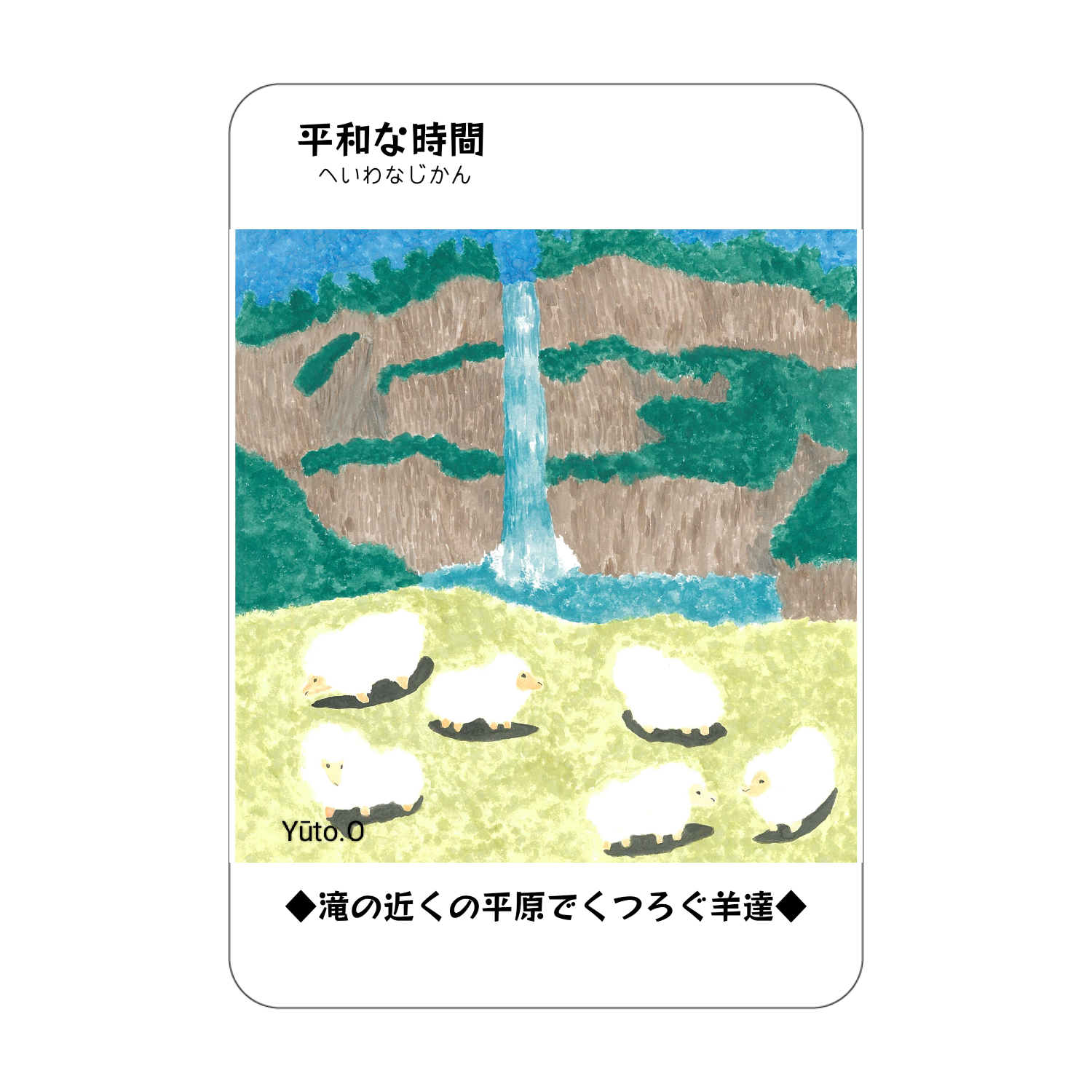 滝の近くの平原でくつろぐ羊達が描かれたアクリル製のコレクションカード。