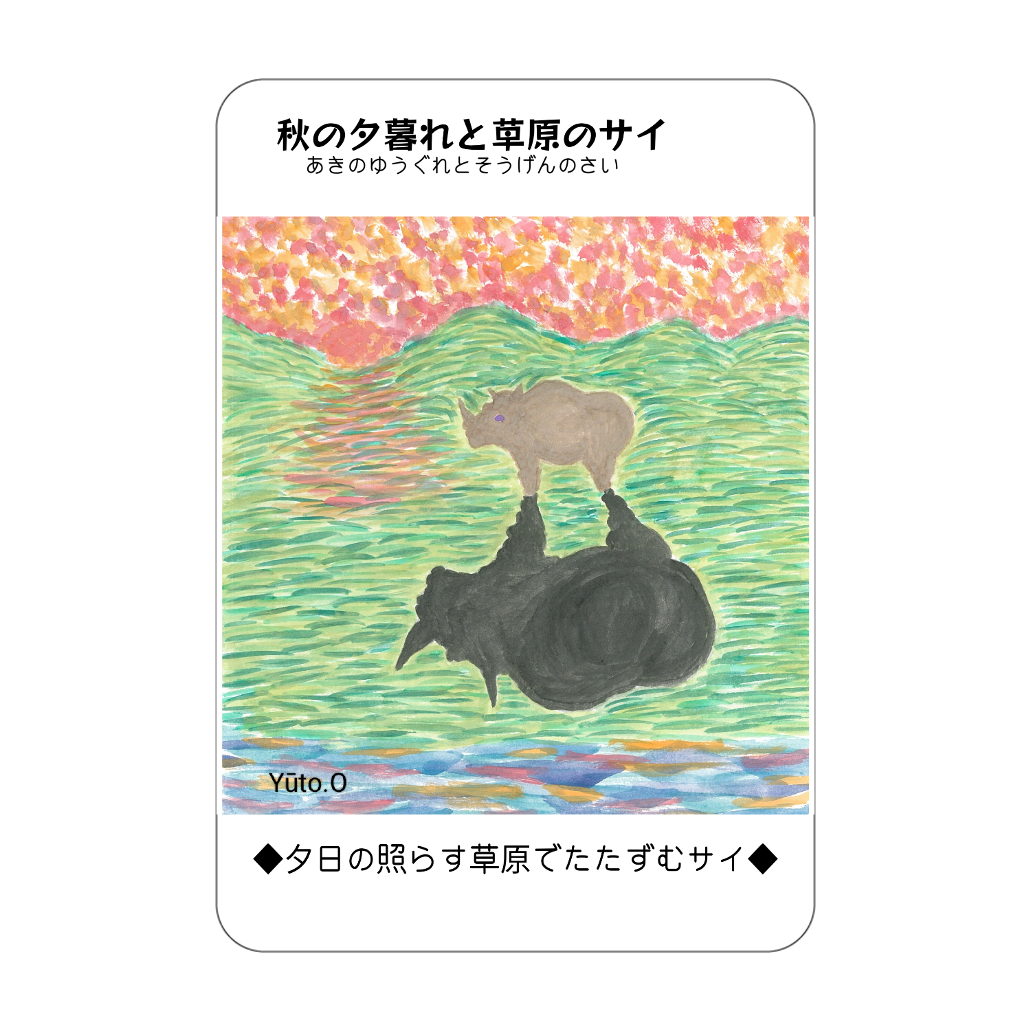 夕日の照らす草原でたたずむサイが描かれたアクリル製のコレクションカード。